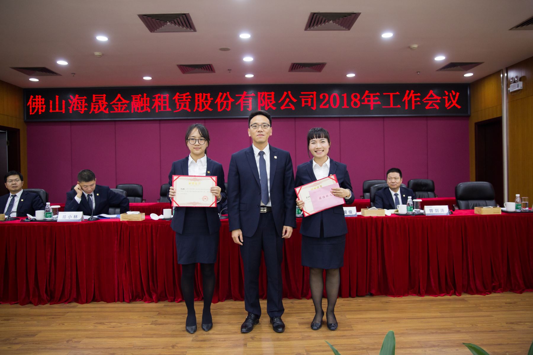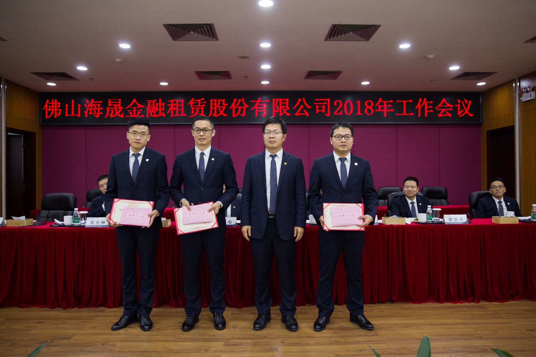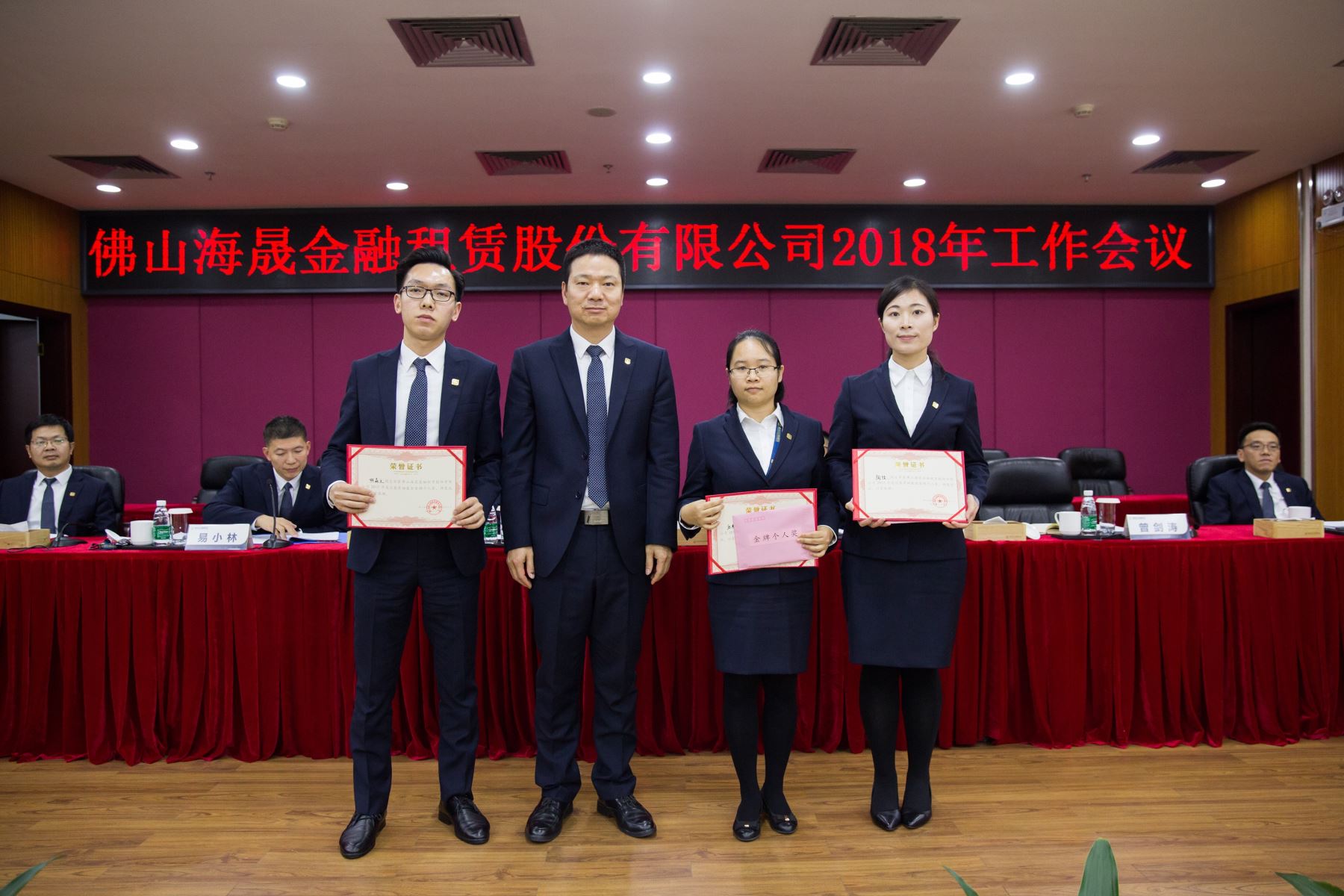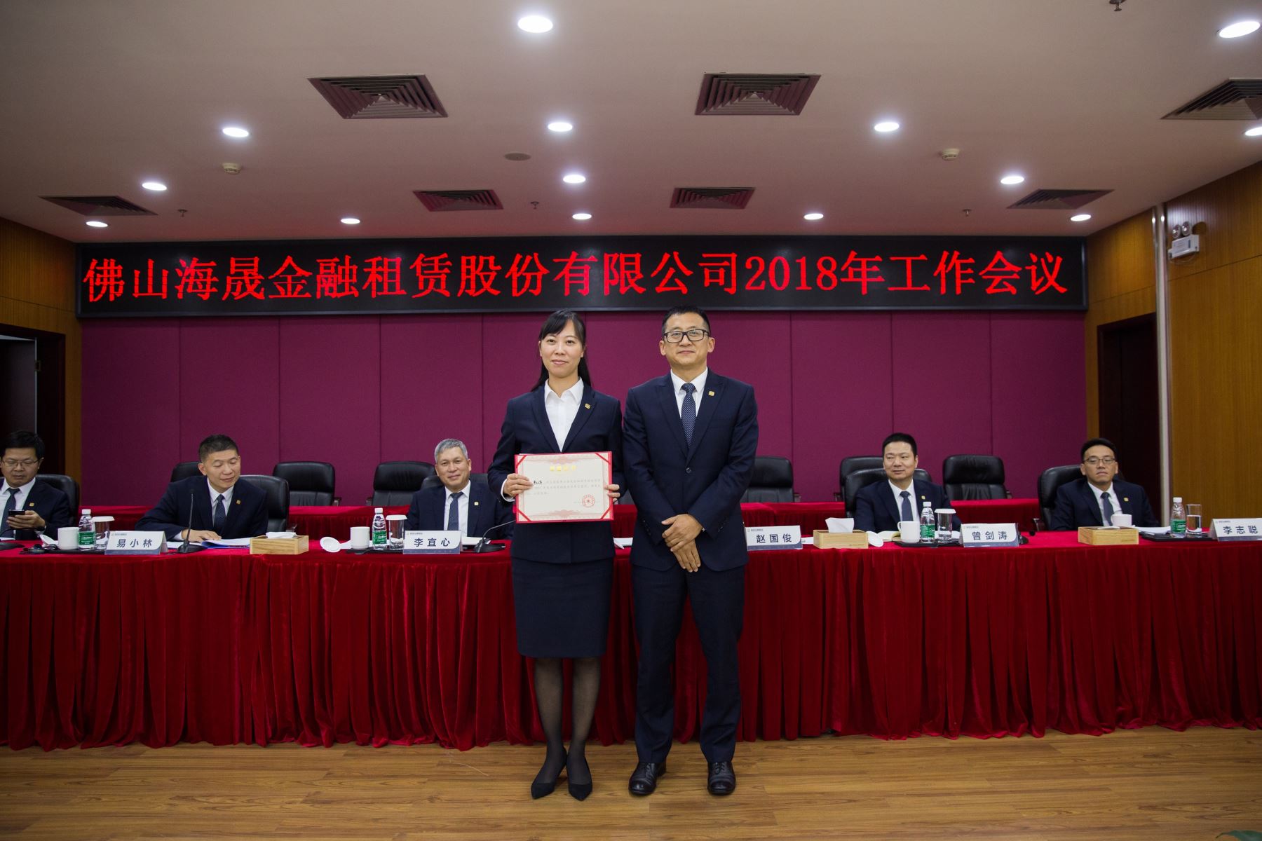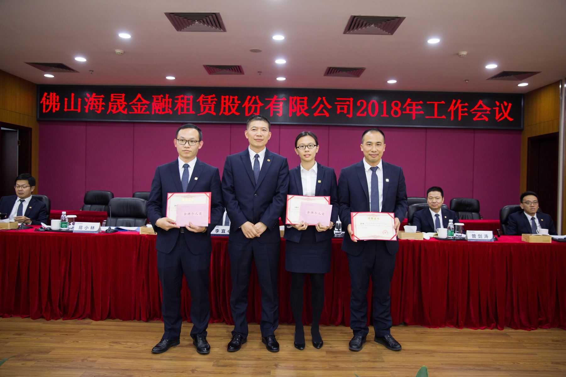 2018年1月19日下午,佛山海晟金融租赁股份有限公司在大股东单位南海农商银行3楼会议室召开2018年工作会议,李宜心董事长、公司经营班子领导及全体员工出席了会议。本次会议议程共分三部分内容,首先由赵国俊总裁作了题为“砥砺奋行,开创公司发展新局面”的工作报告,其次,公司隆重举行了2017年度总裁奖励基金奖获奖员工颁奖仪式,最后,李宜心董事长对公司今后发展作了重要指示。会议在一片祥和欢愉的气氛中圆满结束。