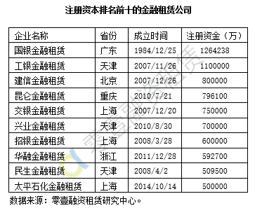 国银租赁注册资本跃居首位 ,63家已成立的金融租赁公司中,国银租赁2016年7月赴港上市后,注册资本由此前的95亿元提升至126亿,注册资本超过工银,居于首位;其次是工银金融租赁,注册资本110亿元,第三名为建信金融租赁,注册资本80亿元。