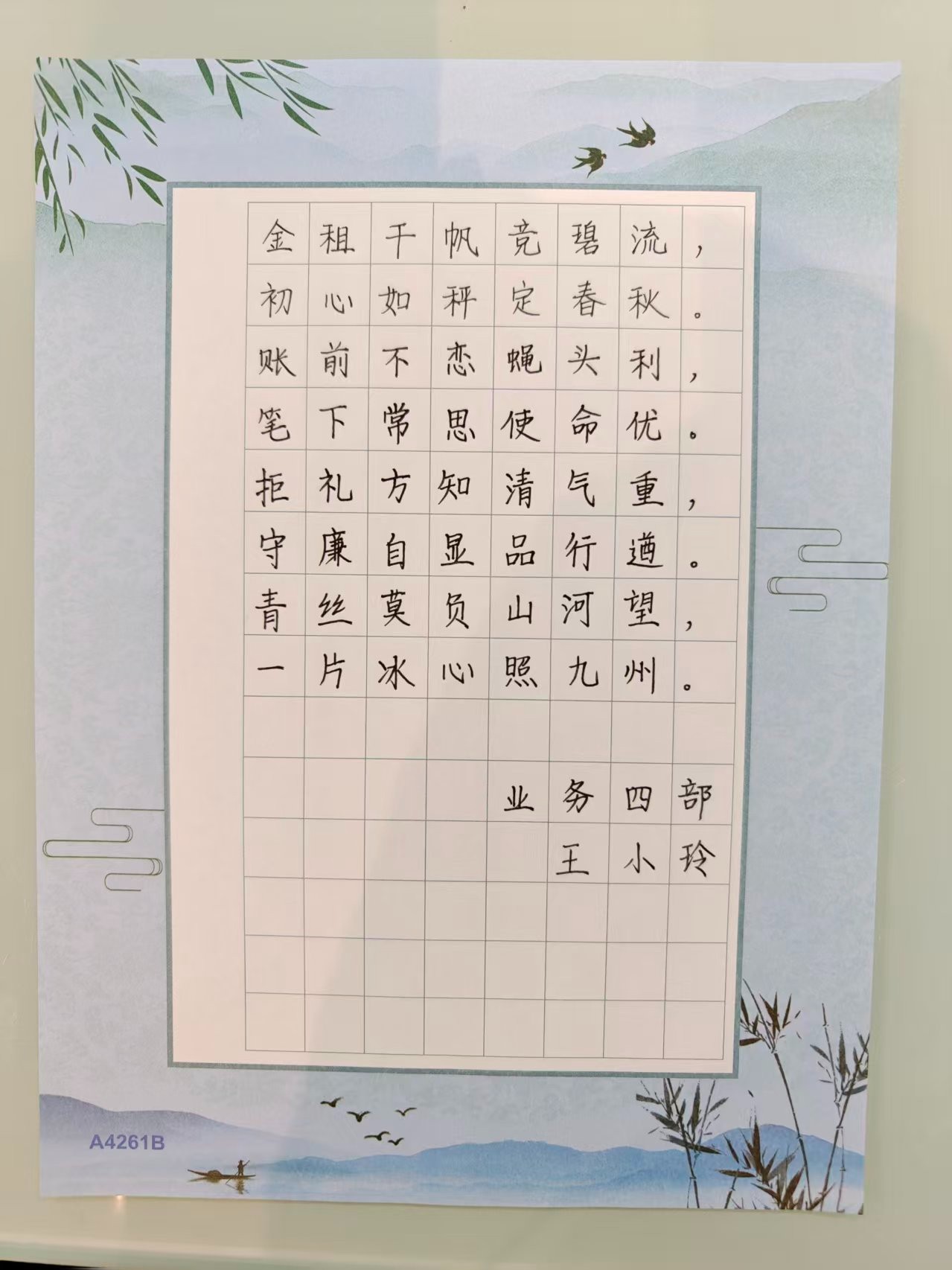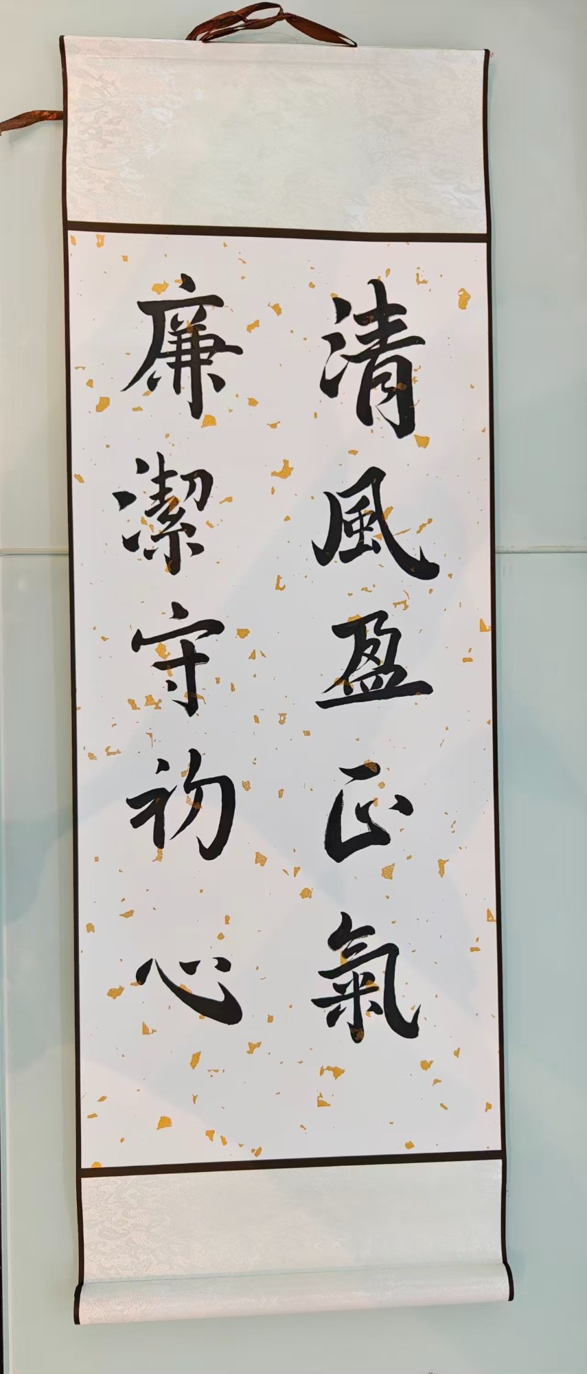 作品简介:这幅书法以“清风盈正气,廉洁守初心”为主题,笔墨清朗,风骨铮铮,如金融之舟行于碧水,唯清风可扬帆,唯正气能定向。字里行间,廉而不冽,洁而不孤,初心若锚,稳泊于喧嚣之外。悬于厅堂,不指一事一物,却使万端生意皆在静默中自律;观于片刻,可令心尘顿洗,长留清辉。让清风穿过年报,让正气充盈合同,以租赁之笔,画金融净土。愿我司与同业共沐此风,市场浩瀚,皆成清流。