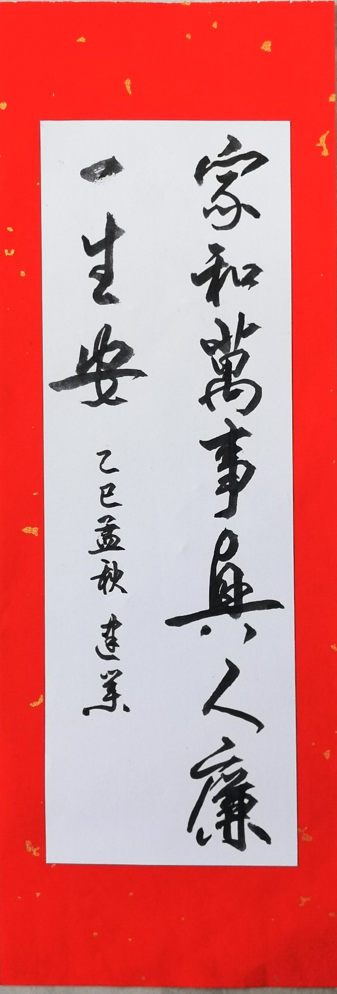 作品简介:上联“家和万事兴”,道出家庭和睦乃事业昌隆之基石,是传承千载的治家智慧;下联“人廉一生安”,则深刻揭示了清廉正直是个人安身立命、心境坦然的根本。两者并行,由内至外,共同构筑了圆满人生的崇高境界,是一份对美好生活的祝愿和修身齐家的格言,寓意着清廉自律方能带来内心长久的安宁与家庭的兴旺。