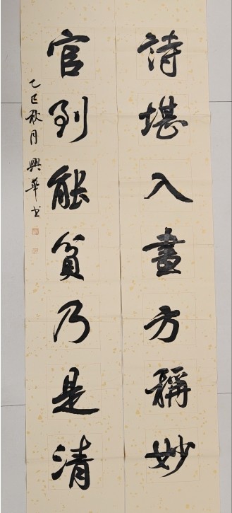 作品简介:书法作品所写对联的寓意:写诗作画宜自然、清新而不落俗套;为官之人应一心为百姓谋福,不计较自身利益,这是一种理想境界,也是殷切的期望。